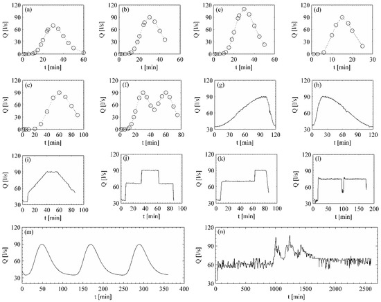 Unsteady runs employed in this study. Images (a–f) are experiments 2005OLIVETO01U, 2005OLIVETO02U, 2005OLIVETO03U, 2005OLIVETO04U, 2005OLIVETO05U and 2005OLIVETO06U, respectively; images (g–l) are experiments 2017PIZARRO01U, 2017PIZARRO02U, 2017PIZARRO03U, 2017PIZARRO04U, 2017PIZARRO05U and 2017PIZARRO06U, respectively; and images (m,n) are experiments 2017LINK01U and 2017LINK02U, respectively.