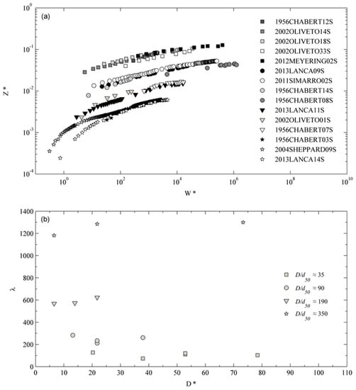 (a) Relative scour evolution over W* for the four categorized classes; (b) λ calibrated values in function of the dimensionless particle diameter D*.