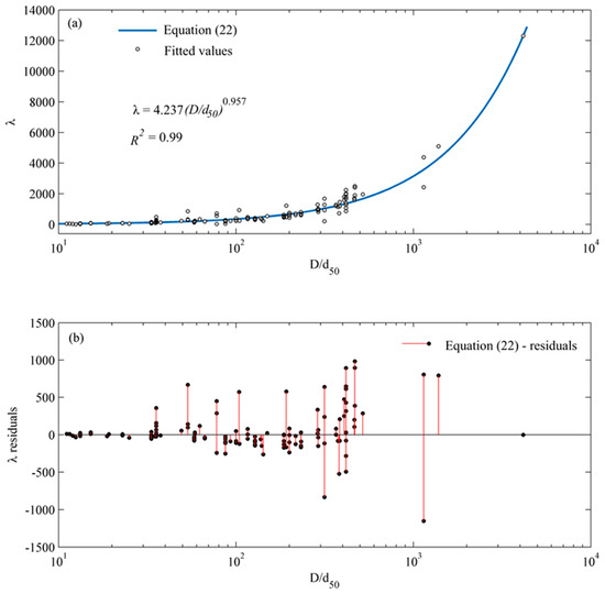 where and are fitting coefficients that were determined by the procedure presented in Section 4.3, obtaining and with a determination coefficient and a RMSE equal to 49. Equation (22) is plotted in Figure 5a in comparison to the fitted values and Figure 5b presents the residuals between calibrated and estimated .