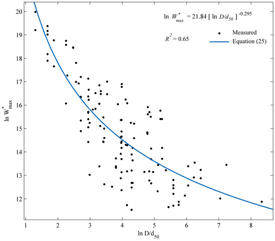 The hydraulic effects in the original S/M formulation are represented by and . On the other hand, has the capacity to integrate these hydraulic effects on the local scour process. Therefore, and can take a convenient value with the aim of writing it in a function of . Considering makes it possible to be on the safe side from a design perspective and, consequently, this value was selected: