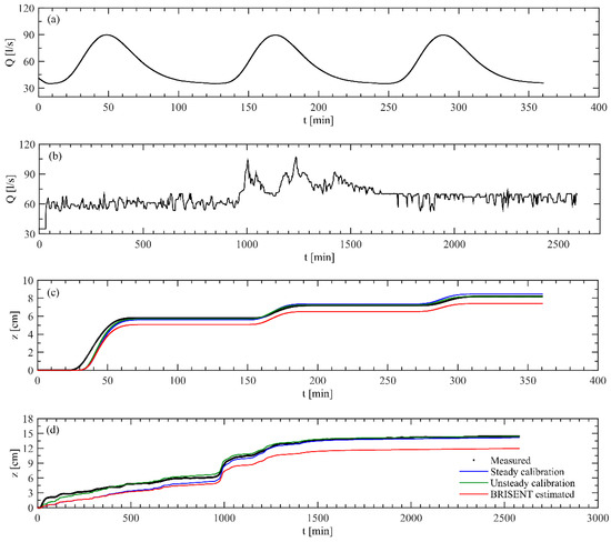The BRISENT model was validated using highly unsteady and multi-peaked hydrographs pertaining to Link et al. [22]. Validation runs are plotted on Figure 7a–d, presenting the time-dependent evolution of the measured scour depth in contrast to the BRISENT model calibrated and estimated according to the proposed equations (Equations (22), (26) and (27)).