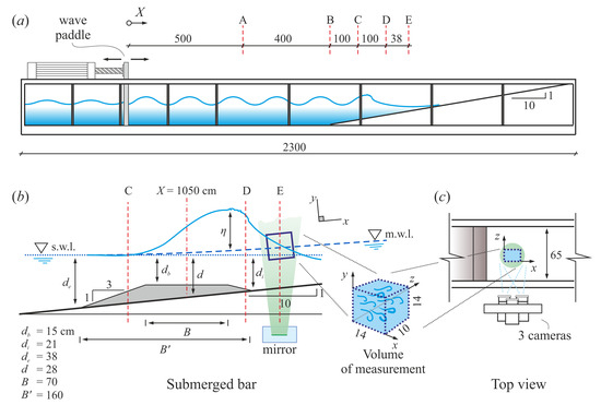 The experimental flume adopted for the tests: (a) side view of the flume; (b) layout of the bar and of the volume of measurement; (c) top view showing the cameras of the V3V system. The still water depth in the mid section of the bar ( cm) is cm. The dot line indicates the still water level, the dashed line is the mean water level (wave set-up or set-down). Dimensions are in centimeters.