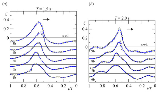 Wave profiles in the section of velocity measurements (Section D) for (a) the tests with , and (b) the tests with . The dashed lines limit the standard deviation band for the sample of 10 wave cycles during velocity acquisition.