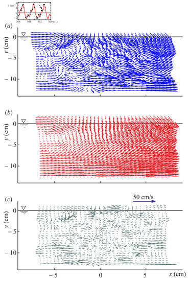 Experiment 6b, a single snapshot in a sequence of 13 shots of the first measured wave cycle. (a) Instantaneous velocity in the midplane of the flume (z = 0); (b) phase-averaged velocity; (c) velocity vectors difference (fluctuating velocity) between the instantaneous velocity and the phase-averaged velocity. Only velocity components in the x–y plane are shown. The inset depicts the surface elevation time series, with the symbols indicating the time of the shot. (modified from Clavero et al., 2016 [16], with permission).