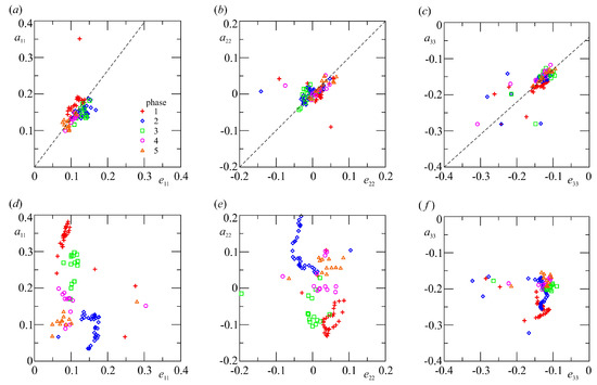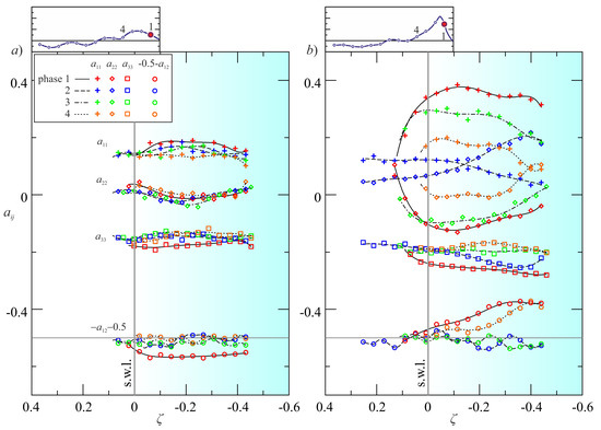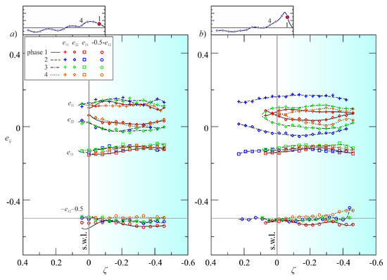 The main elements of the anisotropy tensor for four phases across breaking. (a) Experiment 6b; (b) Experiment 9b. The element is shifted downward, and only one experimental data of two is shown for an easy visualization.