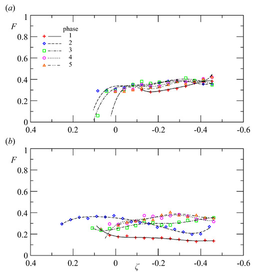 An anisotropy measurement suggested by Lumley and Newman (1977) [20] is , which varies between for a two-component turbulence, and for the three-component isotropic turbulence. Figure 7 shows the invariant function F for two experiments, five phases across breaking, first cycle.