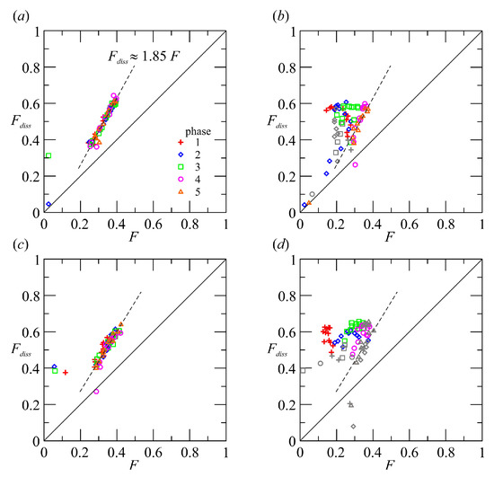 Comparison of the invariant function of the turbulence and of the dissipation tensors for the first five phases. (a) Experiment 1b; (b) Experiment 2b; (c) Experiment 6b; (d) Experiment 9b. The dashed curve is the interpolating line. Gray symbols refer to measurements above the still water level.