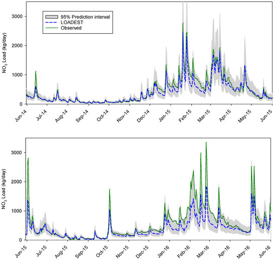 Prediction intervals were derived to assess the precision of the regression models given by LOADEST. The upper and lower prediction intervals contain an area that is likely to include the mean response with a certain probability. Following [34], for a given regression relationship, the prediction limit for a new observation corresponding to is estimated as: