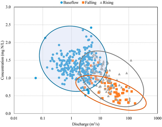 Figure 4 shows boxplots for historic nitrate concentration samples (mg N/L) collected by USGS at different stages of the hydrograph (Baseflow, Rising, Falling). As displayed in the Figure 4, baseflow samples reflect higher concentrations compared with the other groups, and falling samples exhibit the lowest concentrations amongst all groups. The three group means differed significantly (p < 0.01) from each other. When the sample concentrations were plotted against discharge (Figure 5), a clear clustering pattern was observed. The difference between the rising and falling limb sample concentrations can be tied to hysteresis in the discharge-concentration relationship for any single event.