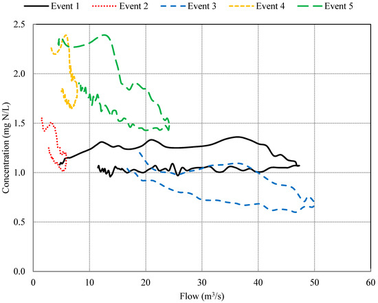 To test whether hysteresis has a strong role in nitrate delivery in the Greensboro watershed, concentrations for each event were plotted against discharge. Figure 6 plots results for five selected storm events (out of 34); the selected events cover the range of monitored storm magnitudes. All events exhibited a form of positive hysteresis effect (clockwise loop), whereby constituent concentrations on the rising limb of a storm hydrograph were higher than those measured at equivalent flows on the falling limb. Data in Figure 6 also demonstrate that the hysteresis loops all tend to fall from top-left to bottom-right, suggesting that there is a dilution of nitrate on the rising limb of each storm event, as discussed by [36].