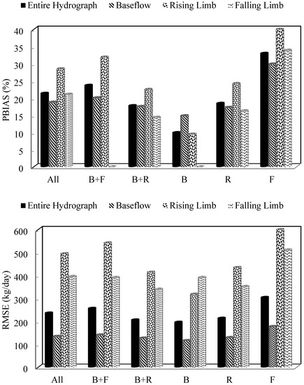 The regression relationships were validated against observed (real-time sensor) loading data using the percent bias (PBIAS) and root mean square error (RMSE) of prediction. Note that PBIAS and RMSE of prediction were calculated for the whole real-time observation period (entire hydrograph) and at different stages of the hydrograph (i.e., baseflow, rising limb, and falling limb) (Figure 7). This assessment provides insight into what stages of the hydrograph are more uncertain and harder to predict.