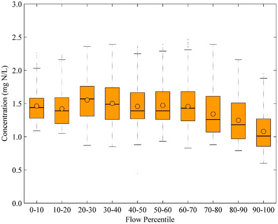 Boxplots of storm nitrate concentration at different flow percentiles for all monitored storm events. The error bars and circles inside the colored boxes represent the median and mean of the data. The lower and upper edges of boxes represent 25th and 75th percentiles. The error bars outside the colored boxes represent the 10th and 90th percentiles, and the dots represent 5th and 95th percentiles.