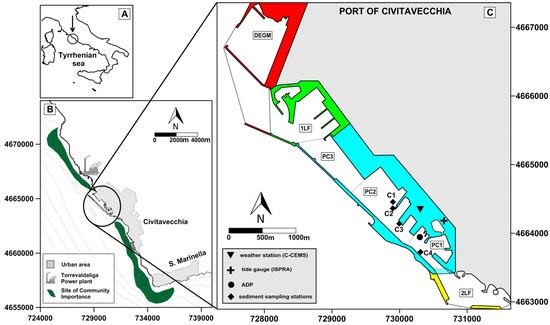 41]. Since 2005, the marine environment of Civitavecchia port is continuously monitored through the C-CEMS observational system (Civitavecchia Coastal Environment Monitoring System), which enables the analysis of coastal processes at a high spatial and temporal resolution [