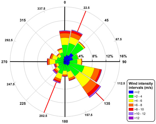 Figure 2 (over the temporal interval between 2008 and 2017) shows that prevailing wind events derive from the southeast (mean annual occurrence of 13%) and from the northeast (mean annual occurrence of 10%). The maximum wind speed recorded by the weather station was derived 135° from north and was about 20 m/s. The second and third quadrants show events with low mean annual occurrence (<5%) and high wind speed values (>18 m/s) only in the southwest direction.