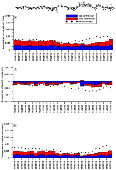 Figure 3 shows the contribution of the wind (red bars) and tide (blue bars) on the water circulation within Civitavecchia port. Although the tide excursion was not very high, its effect was greater than that of wind, particularly when the study area was characterized by wind events coming from the southern quadrants. On the contrary, the contribution of the northern winds to the water circulation within the harbour basin was higher than that derived from the tide.
