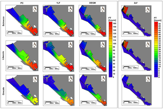 22]. This unfavourable condition is particularly enhanced by the expansion of the port analysed in the hp2 configuration, confirming that the harbour basin size has a significant impact on the renewal of water masses within a harbour domain. The weather condition that resulted in the highest FT values in hp2 was Libeccio (~180 h), followed by Scirocco (~170 h). Conversely, Grecale wind favoured a more rapid exchange of water (~40 h) by inducing higher current speeds in the harbour basin. These values are in agreement with those calculated for the dimensionally analogous Terragona (~40 h [