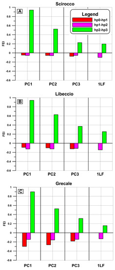 Figure 5). The DEGM was not considered because the successive changes in the harbour structures (2LF) did not significantly alter the values of FT within this area. The realization of the infrastructures connected to the 1LF (hp0 vs. hp1) and DEGM (hp1 vs. hp2) modules resulted in a worsening of water renewal within the harbour basin. This effect was particularly pronounced between the hp0 and hp1 configurations during the northeast condition, where FEI was approximately −0.29, −0.27 and −0.19 in PC1, PC2 and PC3, respectively. During Scirocco, the increase in the harbour size did not induce a significant degradation in water quality, since FEI was maintained slightly below zero. The presence of a southern mouth (hp3) resulted in a significant improvement in water renewal in all of the modules that we analysed. The highest values of FEI (>0.9) were attained in the inner part of Civitavecchia port (PC1) in the weather conditions proposed. The index decreased from the northern entrance, where low values (<0.3) occurred in the 1LF module during Grecale and Scirocco.