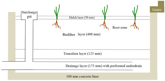 The concentration of each pollutant in the synthetic stormwater was based on the median value that was reported for laboratory simulations elsewhere, averaged with the median value for six grab samples for first flush events at Sydney sites where field units were to be constructed [25,26,27,28,29,30]. It is important to note, that on this basis, synthetic stormwater formulation would vary for each City catchment and that some standardization is ultimately needed [31].