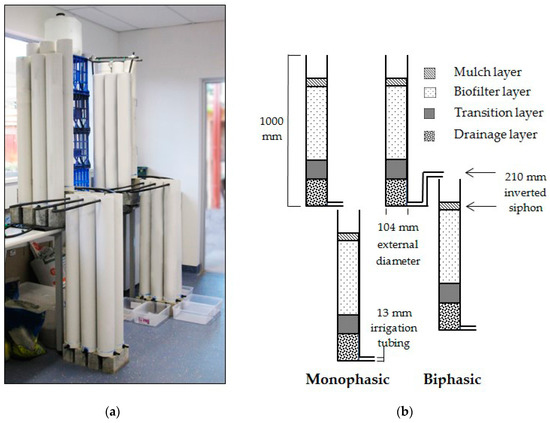 Soil columns that were identical in vertical section to the field biofilters were established using off-the-shelf 104 mm diameter PVC tubing, with the aim of producing a cost- and space-efficient experimental unit with a diameter that would limit potential edge effect and dispersivity in the columns.