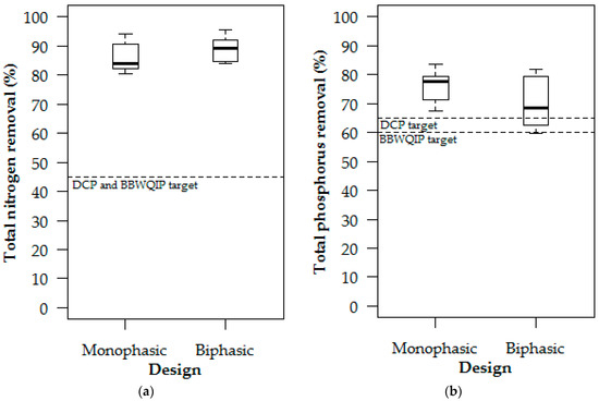 For TP the median removal efficiencies for the two designs were 77.8% and 68.5%, respectively, again both complying with the City’s DCP and BBWQIP targets (Figure 4b). While the full range of experimental results for the monophasic experiments complied with both targets (range = 67.6% to 83.8%), some of the biphasic results in the interquartile range lay outside of the DCP target. It is possible that this target is too stringent for onsite systems, being based on the performance of centralised water treatment works where chemical coagulation or orthophosphate uptake by biomass ensures a high level of phosphate removal [44]. Further research into the full field-treatment train involving bilfiltration, solids removal through terrestrial settlement and mechanical street sweeping is, however, needed before changing the guidelines.