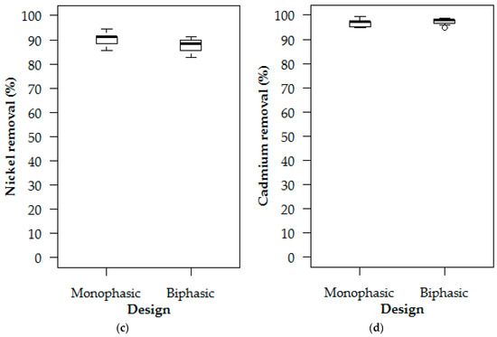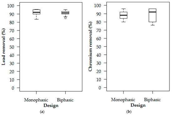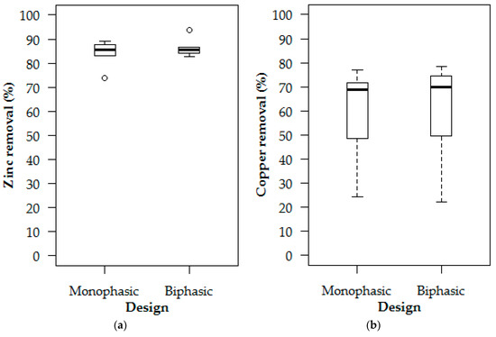 In the simulations, median monophasic and biphasic removal efficiencies for metals were impressive, as shown in Figure 5 as read with Table 2. There was, however, no statistically significant difference between median monophasic and biphasic removals. The large interquartile and total ranges for copper may have resulted from copper leaching from biofiltration media in the early part of the experiment based on its known redox-dependent attachment with organic material [53].