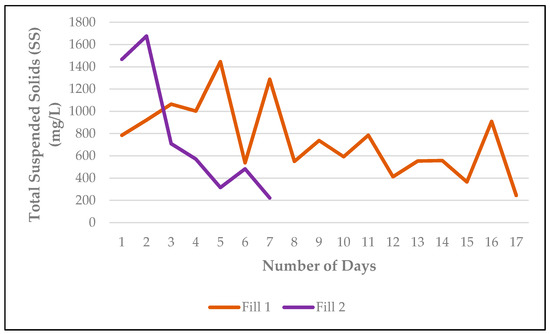 For both of the fills, the final SS level that was achieved was significantly different from the original level (p < 0.01), but nevertheless remained above the ecological trigger value of <50 NTU (equivalent here to an SS of 78.3) within a week of startup (Figure 7) [58]. Of particular concern was the persistence and variation in SS release for Fill 1 as compared to Fill 2, suggesting that even if low absolute SS levels were achieved at startup, the matrix might remain unstable. A basic soil examination of the fills suggested that instability might have resulted from low particulate traction based on the high smooth-to-sharp fines ratio in the mix, as a result of the inclusion of river-dredged sand.