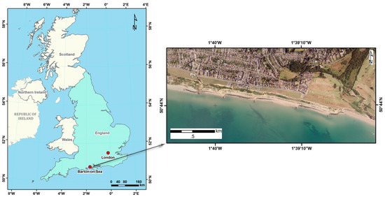 Barton-on-Sea (Latitude 50.7366° N; Longitude 1.6633° W) is a small rural coastal town in Hampshire County, UK, located near to Christchurch Bay on the south coast of England (Figure 1). The population is more than five thousand ONS [48] and contains nearly 2 km of coastline New Forest District Council [49]. Barton-on-Sea is a popular tourist location that generates millions (£) of revenue every year, contributing significantly to the local and national economy. The current study area is categorised by an array of terraced slopes as well as cliffs expanding from a narrow beach to a highland at about 31 m to 33 m [50] and storm surge [51]. The upper cliffs contain nearly vertical slopes varying between 5 m and 10 m in height, while an undercliff is comprised of an array of steep scarps parted by benches between the widths of 5 m and 10 m, and most of the cliffs are characterised by sandy clay Clark [52]. During the storm events, the rainwater does not drain downwards from the cliffs because of the absence of good drainage and low permeability of local geology. This results in adding more weight and an increase in pore water pressure to the cliff region, which causes cliff erosion and landslides. The coastal protection procedures were initially started in 1930 by constructing wooden groynes and revetment [49], but these structures have been severely damaged by intense and repeated storm events. Recently, £4.5 million worth of new coastal protection procedures (rock armour and the planting of vegetation) were implemented to protect the coastal frontage from diverse coastal hazards New Forest District Council [49].