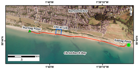 The current study used the four parameters (Table 2) to evaluate the coastal vulnerability of Barton-on-Sea. Accordingly, transect lines were drawn vertically to the coast at 100 m × 100 m cell spacing on 2 km of coastline (Figure 2). In line with Denner et al. [34], the back beach was used as a proxy baseline; measurements extended to a line drawn 100 m inland nearly parallel to the baseline and as far as mean low water in a seaward direction. Consequently, in-depth measurements based on each and every parameter were recorded along each transect.