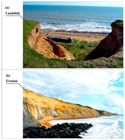 Barton-on-Sea: Landslide and coastal erosion damage along the shoreline in March 2017. (a) Landslide’s damage; (b) Coastal erosion.