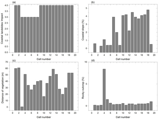Figure 4 shows significant variations in the four parameters for the 19 cells investigated in this study. Coastal landslides impact scored very high for 13 cells (65%) and the rest of the 6 cells (32%) scored a high impact (Figure 4a). Considerable variance existed for coastal slope; the maximum value was 4.8%, recorded at the eighteenth cell, and the lowest was 0.3%, recorded at the third cell, with the average of 2.3% (Figure 4b). The distance of vegetation behind the back beach also showed variations in the minimum and maximum values, which were 0.5 m and 61 m, scored at the third and second cells, respectively, and the average value of distance of vegetation was 39 m (Figure 4c). There was a considerable variation exhibited among the 19 coastal cells for rocky outcrop. The maximum was 5.4%, recorded at the fourth cell, and the minimum was 0.1%, scored at the second cell (Figure 4d). The average rocky outcrop value was 0.9, and 100% of the cells fell into the very high vulnerability category.