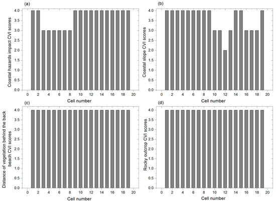 As shown in Figure 5, a considerable variance exists for nineteen cells. The average MTCVI score for coastal landslide impact was 3.6, and the highest was 4, recorded for 13 cells (69%). The lowest score was 3, and 6 cells (31%) recorded this value. These MTCVI scores indicate that a majority of the coastal cells for coastal hazards impact have a very high vulnerability (Figure 5a). For coastal slope, the average CVI score was 3.5, and the highest score was 4, recorded at 14 cells (69%), while the minimum was 2 recorded at the twelfth cell. The CVI scores for the coastal slope reflect very high vulnerability at the majority of the survey areas with some site-specific variations (Figure 5b). No variance exists between the CVI values for the distance of vegetation behind the back beach. The average, maximum, and minimum CVI score was 4. The CVI scores for this parameter explicitly specified that Barton-on-Sea has the highest vulnerability in the subject of vegetation (Figure 5c). No difference exists for the nineteen cells for rocky outcrop. The average, maximum, and minimum CVI score was 4, that indicates very high coastal vulnerability. The CVI scores for rocky outcrop suggest that Barton-on-Sea requires more robust coastal protection procedures (Figure 5d).