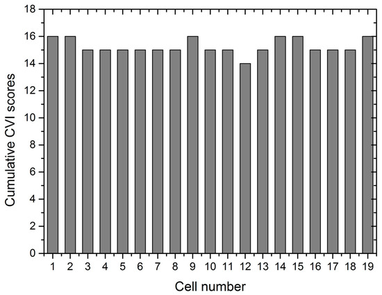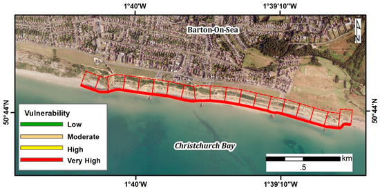 Analysis results revealed that the entire coastline (2 km) of Barton-on-Sea is highly vulnerable, and this is because of coastal landslides together with erosion and the lack of robust shoreline protection measures. Though this region has a rocky outcrop, it is not strong enough to protect the shoreline from high tidal waves, erosion, and associated natural hazards. Figure 6 shows a slight difference exists between the nineteen cells with respect to MTCVI values. The average value was 15.26, which falls in the very high category. However, the maximum MTCVI value (16) was recorded for five cells (26%), and the minimum was 14, scored at the thirteenth cell. The maximum and minimum scores fall in the very high coastal vulnerability category. All cells (100%) were rated with very high vulnerability (14–16), and none of the cells fall between the low and high vulnerability categories. Overall, MTCVI scores indicate that Barton-on-Sea has a very high coastal vulnerability for current scenarios, as shown in Figure 7.