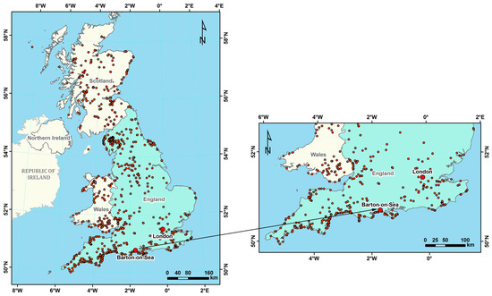 The current study also generated landslide GIS maps of the UK to identify the coastal landslide strikes across the country for the period of 2000–2016 based upon BGS data. As shown in Figure 9, more than 900 (967) landslides (all types) were recorded and >50% of them struck the various coastal sites during the period. Only one coastal landslide was recorded at Barton-on-Sea during this period, and this record clearly differed from Town Council data reported. However, there are conflicting opinions about coastal landslide events, and no accurate information on the definite number is available. Coastal erosion characteristically results in the inland retreat of the shoreline. This can increase the coastal flooding risk, landslides, loss of land, and damage to coastal infrastructure. However, rocky outcrops play a vital natural role in shoreline protection by delaying the erosion [36]. It has been estimated that Barton-on-Sea coastal erosion and coastal landslides are caused by its uneven and diverse hydro-geological nature and high tides and waves [57]. Thomas et al. [58] revealed that variations in external forces may also be accountable for coastline erosion. Tenacious waves and sporadic storms provide substantial vigour to the coastal atmosphere, affecting sediment transport, distressing ecosystems, and damaging infrastructure Gopalakrishnan [59]. However, vegetation (plantation) provides a protective defence for infrastructure, including commercial and residential properties, from high waves. Unfortunately, Barton-on-Sea does not have that much thick vegetation, which makes this region more vulnerable.