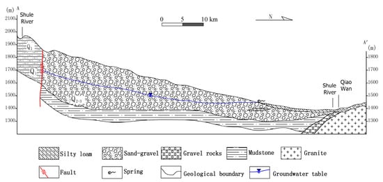 Upon emerging from the Qilian Mountains, water from the Shule River infiltrates into the coarse-grain deposits of the Changma alluvial fan, and accounts for about 80% of groundwater recharge in the basin []. Groundwater within the fan mainly flows from south to north along a hydraulic gradient that changes from 7‰ to 2‰. Groundwater recharge within the adjacent low-relief plain is primarily associated with infiltration along canals and irrigation. The groundwater flows from shallow to deeper zones in the aquifer within the southern portion of the basin. It then flows from deeper to shallower areas of the aquifer, and emerges as springs at the surface, after which it finally merges to form the channel of the Shule River. The Shule River flows from southwest to northeast along this lower reach of the study area; discharge is reduced along the middle and lower reaches of the Shule River because of evaporation and infiltration.