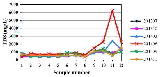 TDS values increased gradually northward along the path of groundwater flow, resulting in relatively high TDS values in spring water emerging along the toe of the alluvial fan. For example, the TDS of spring water at sampling site No. 11 reached 6220 mg/L in June 2014 (Figure 3), presumably in response to strong evaporation, whereas TDS was consistently higher than 1000 mg/L at sampling site No. 12 located in the fine soil plain. Therefore, groundwater quality, as expressed by TDS, declines from the upper section of the alluvial fan toward the center of the basin.