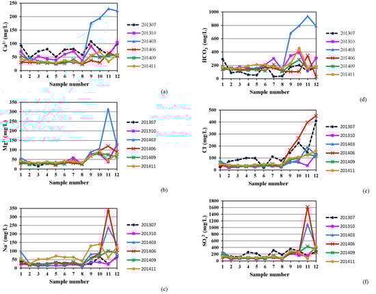 Spatial and temporal variations in the concentrations of: (a) Ca2+; (b) Mg2+; (c) Na+; (d) HCO3−; (e) Cl−, and (f) SO42− ions. See Figure 1 for sample locations.