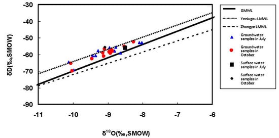 Figure 5 shows the relationship between D and 18O for rainwater (LMWL, GMWL), groundwater and surface water, respectively. Most groundwater samples are located to the left of the GMWL, and near the surface water samples (Figure 5). The isotopic composition of groundwater in the alluvial fan was similar to the values measured in surface water, suggesting that the groundwater was derived from the infiltration of river water coming from the mountains. Most groundwater samples in the alluvial fan exhibit isotopic values that are distributed along the Yeniugou LMWL, which indicates that precipitation in the Qilian Mountains is the primary source of the river water, and thus groundwater, in the upper fan deposits.