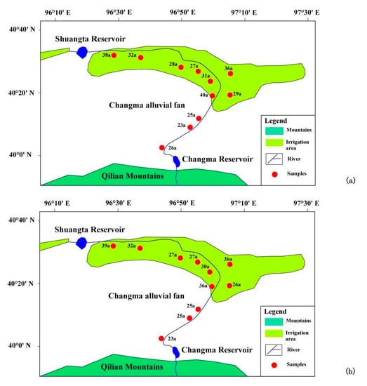 Field work was carried out from July 2013 to November 2014. Twelve sampling sites were positioned from the apex to the toe of the Changma alluvial fan, all of which were located along and adjacent to the Shule River (Figure 1). The sampling sites were selected on the basis of the trend of the Shule River and groundwater flow. Selected characteristics of the sampling sites are listed in Table 1.