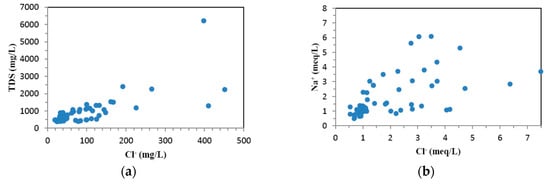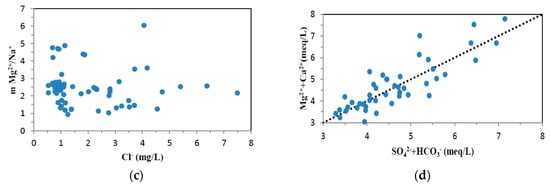 The chemical species dissolved in groundwater are not independent, and the relationship between various ions can be used to study the characteristics and water-rock interaction. The Cl− ion undergoes few chemical reactions in the natural environment, and mainly originates from the dissolution of halite in evaporate deposits. In this arid area, the Cl− concentration is correlated with TDS, as shown in Figure 8a, suggesting that Cl− and TDS increase continuously along the groundwater flow path. The other ions also have good linear correlation with TDS, which demonstrates that dissolution is a major hydrogeochemical process in this region. The ions of Cl− and Na+ have a linear relationship Na+ = 0.6 Cl− + 0.9 (R2 = 0.5) as shown in Figure 8b. The molar ratio mNa+/Cl− is lower than one, which indicates that Na+ is mainly derived from dissolution of halite. The ions of Cl− and K+ are also correlated, and mK+/Cl− is 0.04, indicating that K+ is from dissolution of sylvite. The mMg2+/Na+ ratio ranges from 0.92 to 6.04, with a mean value of 2.47 (Figure 8c). It is consistent with the abundant Mg-rich lithology of this area, indicating that carbonate with high magnesium is rich in the aquifer. Furthermore, there is a good correlation between Ca2+ + Mg2+ and SO42− + HCO3− (Figure 8d, R2 = 0.94), and the slope is 0.9. It indicates that the ions of Ca2+, Mg2+, SO42− and HCO3− are mainly derived from dolomite, gypsum and calcite.