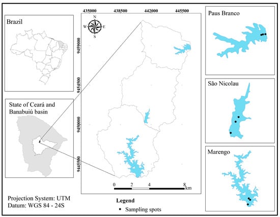 Study site and sampling spots in the reservoirs Paus Branco, São Nicolau and Marengo in the Madalena Basin, nested in the Banabuiú River Basin, Ceará, Brazil. Projection system: Universal Transverse Mercator (UTM) in meter; Datum: WGS 84 (World Geodetic System).