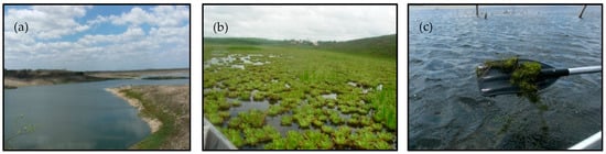 The catchment areas of the focus reservoirs are subject to a similar land use and land cover: free access of animals to water bodies, floodplain crops (called “vazantes”), agrochemical use, practice of soil burning, exposed soil (areas prepared for agriculture or livestock farming) and poor sanitary infrastructure. These practices favor the process of eutrophication. No occurrence of macrophytes is noticeable in the Marengo reservoir (Figure 2a), whereas there was a dense presence of emerged macrophytes in Paus Branco (Figure 2b) and the occurrence of submersed species in São Nicolau (Figure 2c) during the investigation period.