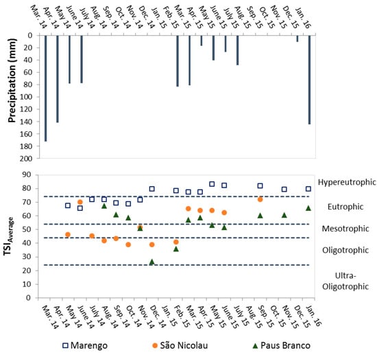 Observed precipitation at Madalena rainfall gauge (Ceará) and mean Trophic State Index (TSI) at Marengo, São Nicolau and Paus Branco reservoirs from May 2014 to January 2016.