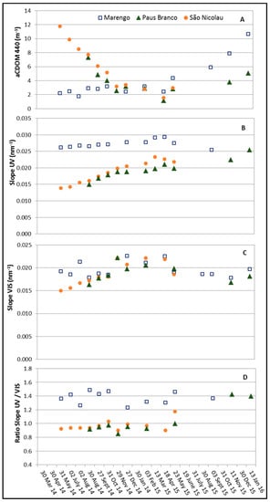 (A) Mean values of specific absorption coefficient aCDOM at 440 nm; (B) spectral slope of CDOM in the ultraviolet range (275–295 nm); (C) spectral slope of CDOM in the visible range (350–500 nm) and; (D) ratio slope (SUV/SVIS) for Marengo, Paus Branco and São Nicolau reservoirs from May 2014 to January 2016.