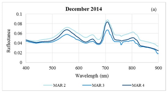 Radiometric in situ data are expressed as spectral reflectance (Figure 5). Each measurement was taken from an average of three readings resulting in a spectral database of 45 spectral signatures showing distinct features between MAR, PB and SN reservoirs. Across the spectrum, the reflectance from Marengo was higher than the reflectance from PB and SN reservoirs. On every measurement date of December 2014 (Figure 5a), February 2015 (Figure 5b) and November 2015 (Figure 5c), the reflectance showed a distinct reflectance peak in the green region (~570 nm), an absorption feature in the red (~675 nm) and another high reflectance peak around 710 nm. The reflectance spectra from SN in February 2015 show the lowest reflectance values and overall flatness. The reflectance spectra from PB in February 2015 show high reflectance in the visible, but more absorption in the NIR wavelength region than the reflectance of Marengo.