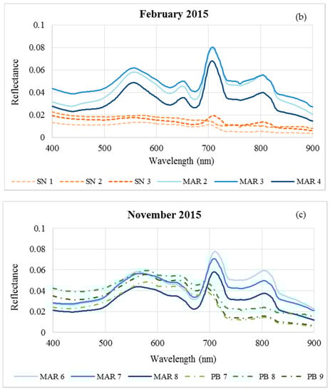 In situ spectral reflectance of the Marengo (MAR), Paus Branco (PB) and São Nicolau (SN) reservoirs sampled on: (a) December 2014; (b) February 2015; and (c) November 2015.