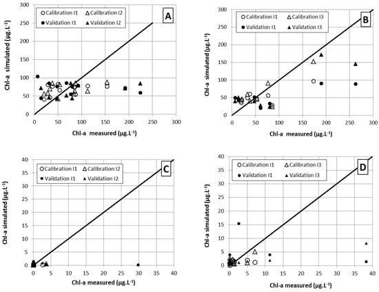 Chlorophyll-a. (A) Perennial reservoir and Landsat-8; (B) perennial reservoir and RapidEye; (C) non-perennial reservoirs and Landsat-8; (D) non-perennial reservoirs and RapidEye.