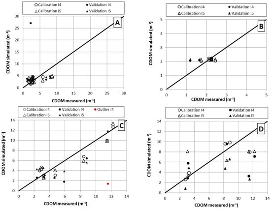 CDOM. (A) Perennial reservoir and Landsat-8; (B) perennial reservoir and RapidEye; (C) non-perennial reservoirs and Landsat-8; (D) non-perennial reservoirs and RapidEye.