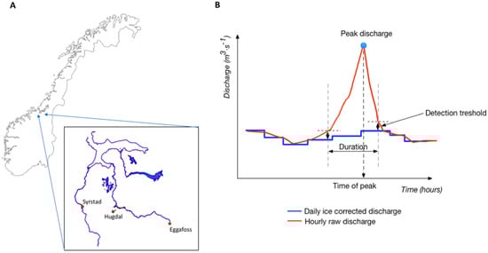 Study sites (panel (A)), and the principle of detecting ice-induced peaks and their characteristic features from a combination of a daily ice-reduced series (blue) and a raw data series (red) (panel (B)). For each year, the maximum peak level and the time of the maximum peak are derived from all yearly events. The detection threshold marked on the figure eliminates effects of small fluctuations on the detected peaks. This is a schematic figure only; therefore, there are no values on the axes.