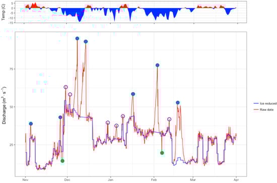As mentioned, in the case in which hourly raw data is combined with daily resolution-corrected data, it is important to take into consideration that the averaging of hourly data into the daily series that is ice-corrected might mask instantaneous, short-duration natural peaks found in the hourly data set. These deviations may not be captured by the detection threshold described above. To account for this, in situations in which the average of the hourly values in a day and the constant daily value is similar, peaks are not classified as ice-induced.