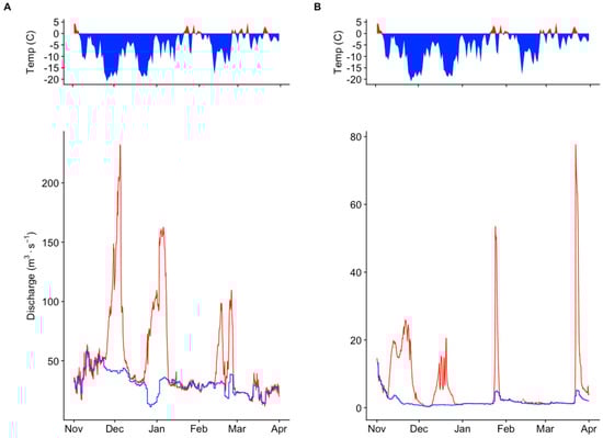 Looking at the open-water indexes, e.g., the Index of Hydrological Alteration (IHA), analysis of ice reduced data alone would underestimate winter high flow periods and probably also miss potential short low flow periods. Similarly, using uncorrected data without allowing for ice effects, ice-driven high flows would bias the computation of winter low flow and the duration of winter low flow periods. The issue of winter high flow periods is addressed by Peters, Monk, and Baird [27] as timing and magnitude. For smaller rivers and, particularly, regulated rivers with an unstable ice cover, indices describing the frequency and duration of such episodes are necessary, since an ice-driven variability in the flow regime could influence a number of ecological processes. The frequency of such events would also be an indicator of the stability of the ice cover in the reach.
